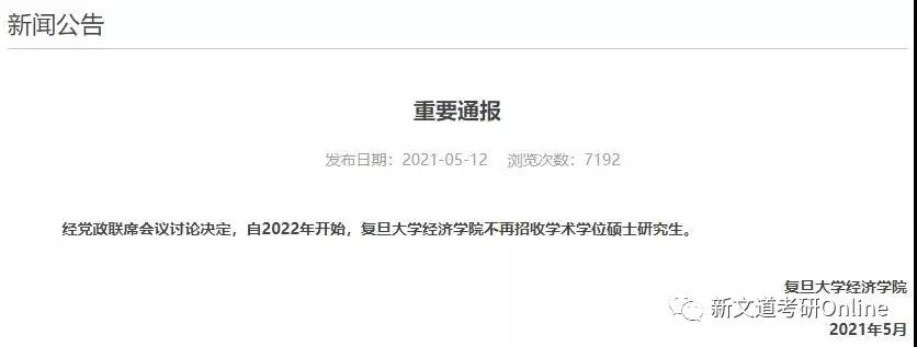 復(fù)旦大學(xué)經(jīng)濟(jì)學(xué)院發(fā)布公告:“經(jīng)黨政聯(lián)席會議討論決定,自2022年開始,復(fù)旦大學(xué)經(jīng)濟(jì)學(xué)院不再招收學(xué)術(shù)學(xué)位碩士研究生。”