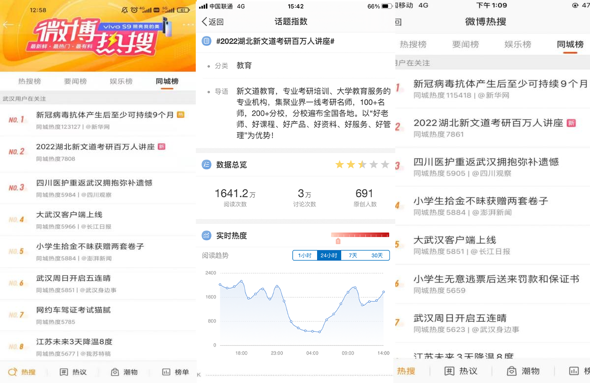本次活動采用“線上+線下”結合的方式,線下舉行大型講座的同時,20余家平臺參與線上同步直播。據統計,本次講座線上總參與人數超過110萬,“百萬人”考研講座名副其實,在全國媒體聚焦下傳播效果也遠超預期。講座舉行當天,新浪微博超級話題 #2022湖北新文道考研百萬人講座# 迅速被推上同城熱搜榜第2名,微博話題總閱讀人次超過1640萬,成為考研圈超高熱度話題,而“2022考研百萬人公益講座”老師視頻更是頻頻刷爆朋友圈。