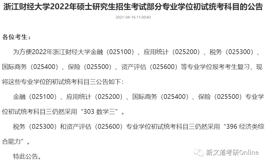 金融、應用統計、國際商務、保險專業學位初試統考科目三仍然采用“303 數學三”,稅務和資產評估專業學位初試統考科目三仍然采用“396 經濟類綜合能力”。