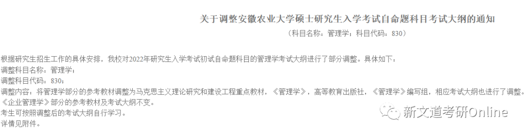 初試自命題科目的管理學考試大綱進行了部分調整,調整內容為:將管理學部分的參考教材調整為馬克思主義理論研究和建設工程重點教材,《管理學》,高等教育出版社,《管理學》編寫組,相應考試大綱也進行了調整。