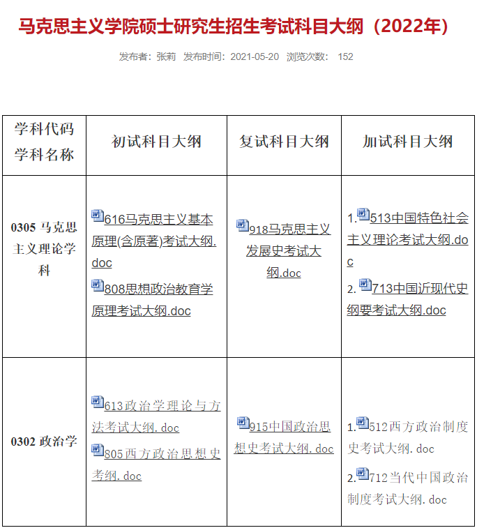 5月20日,該校官網發布了《馬克思主義學院碩士研究生招生考試科目大綱(2022年)》,明確了初試及復試科目大綱。