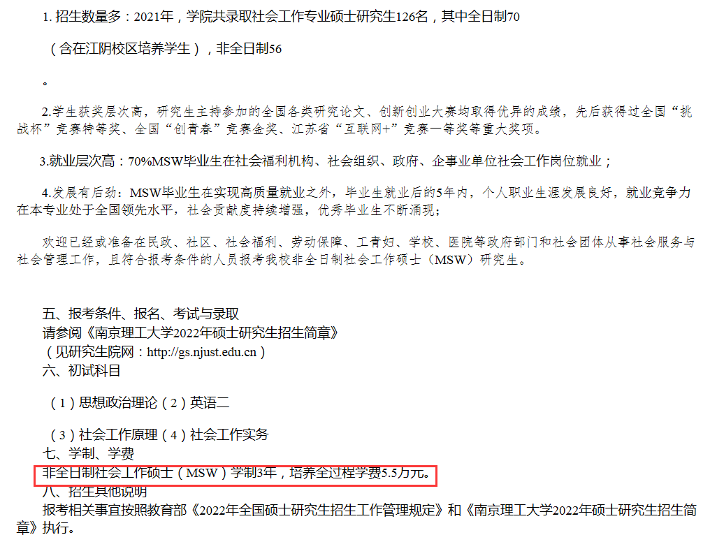 南京理工大學非全日制社會工作碩士(MSW)學制3年,培養全過程學費5.5萬元。