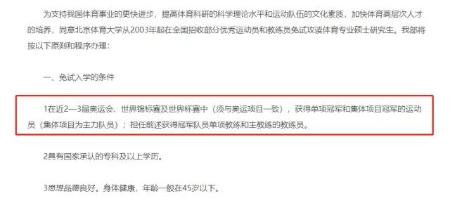 早在2003年,教育部就發布了相關通知,奧運會、世界錦標賽及世界杯賽中,獲得冠軍的運動員,或擔任冠軍運動員教練的教練員,在滿足基本條件后,即可免試入學讀研,也就是我們所說的保研。