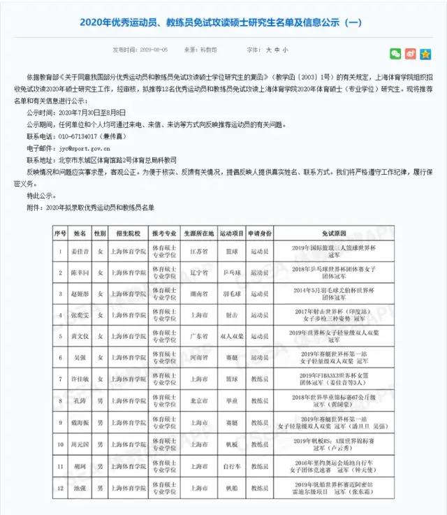 2020年有12位優秀運動員和教練員免試攻讀了上海體育學院的研究生,報考的均是體育碩士專業學位。